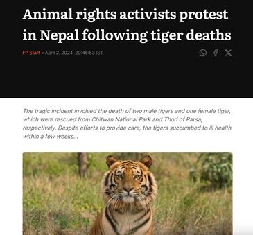 Animal rights activists in Nepal gathered Tuesday in front of the World Wildlife Fund (WWF) office to protest against the recent deaths of three tigers confined in a cage at the Parsa National Park. The protest at the WWF office in Baluwatar aimed to raise awareness about the plight of captive animals and call for stronger measures to ens